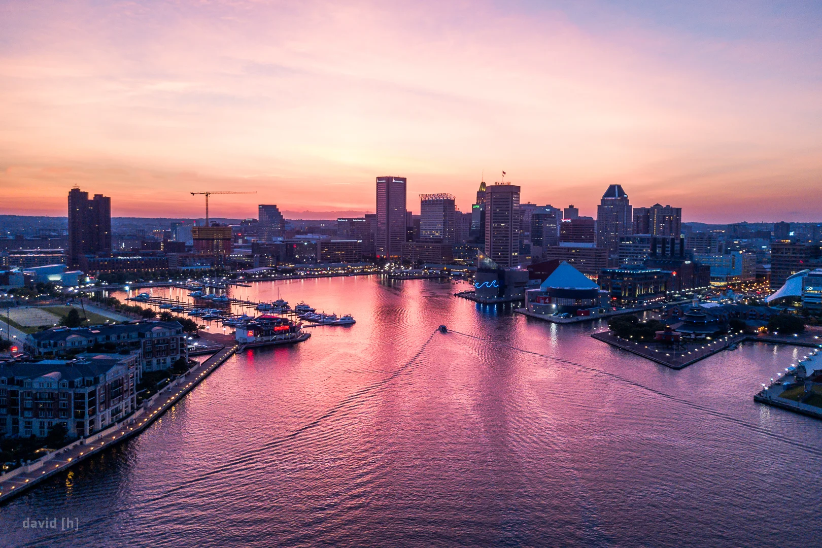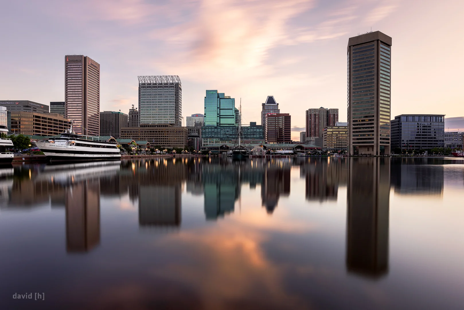 The Baltimore Skyline as seen from the inner harbour, just after sunrise.